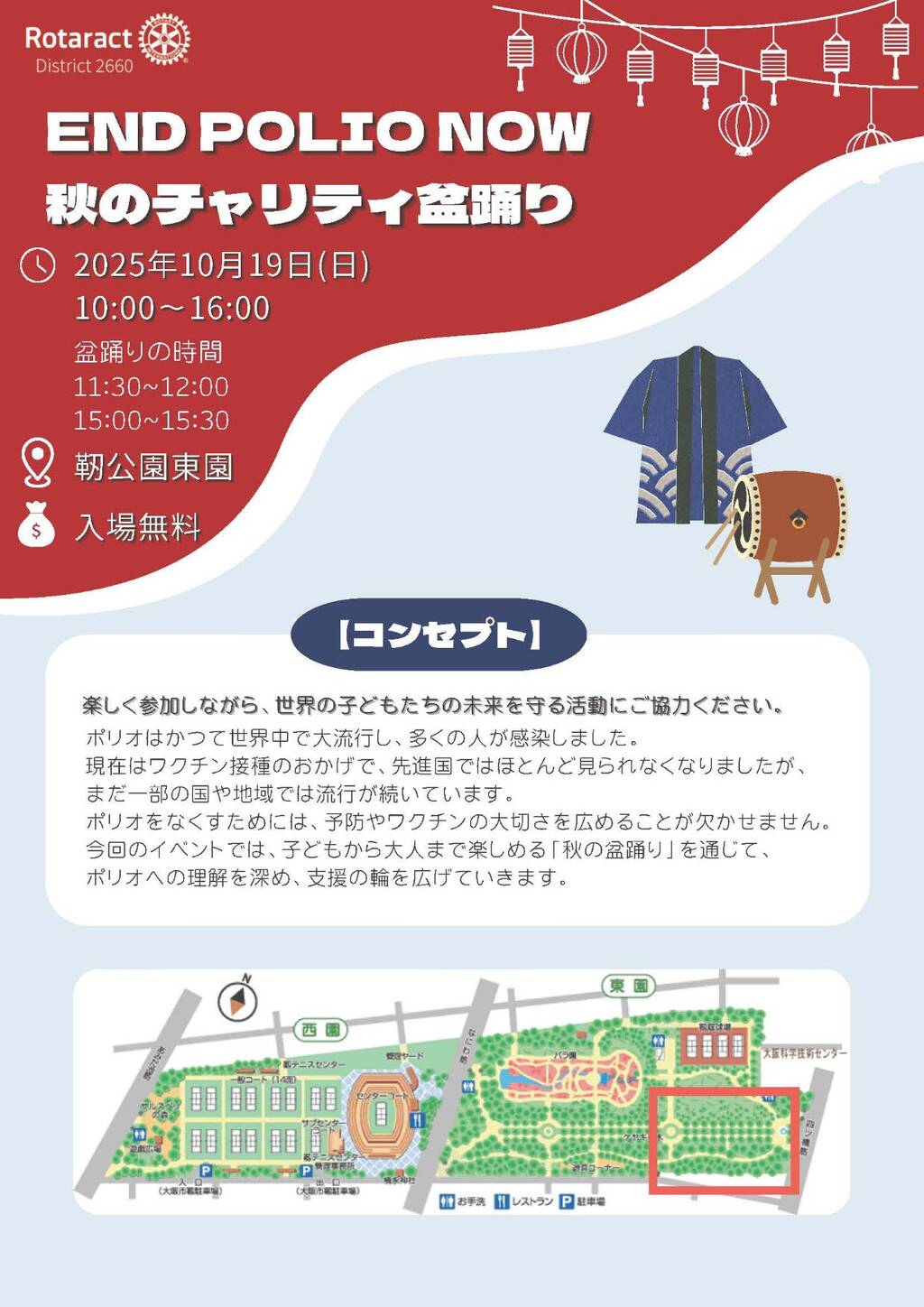END POLIO NOW秋のチャリティ盆踊り 入場無料 主催 ローターアクトクラブ 共催 ロータリー学友会 開催日 2025年10月19日(日)10:00~16:00 会場 靭公園東園 〒550-0004 大阪府大阪市西区靱本町1-9